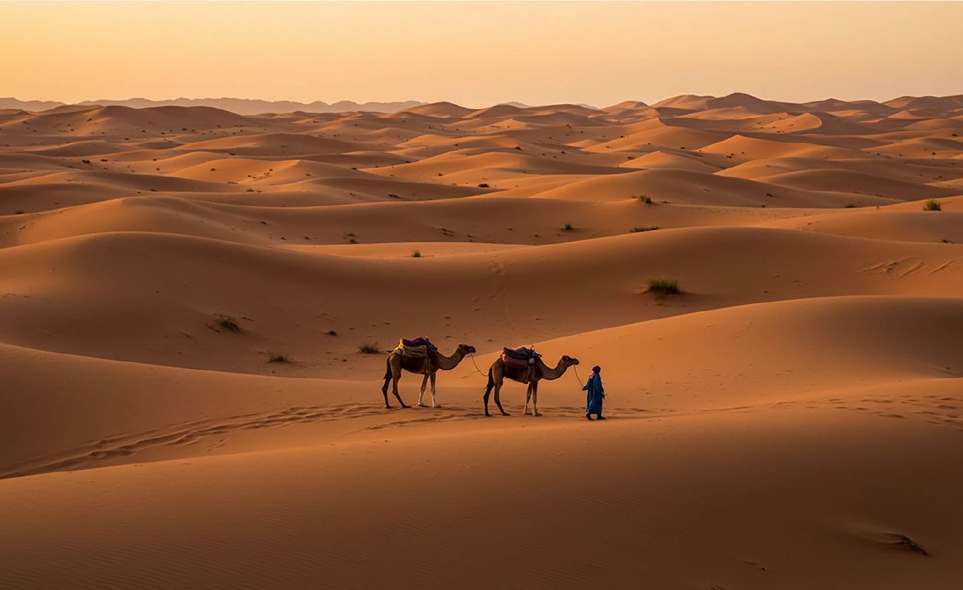サハラ砂漠の入り口。砂丘のサイズ感が“想像の3倍”で、ラクダが普通に似合う世界。朝日と星空の破壊力が強すぎて、旅の思い出ランキングを勝手に乗っ取ってきます。