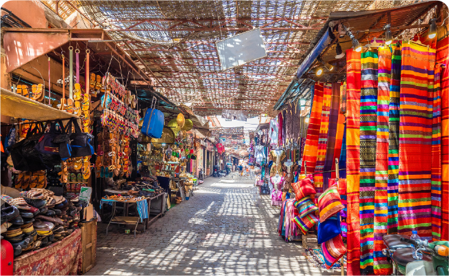 スーク(市場)が楽しすぎる旅の遊園地。カラフル雑貨・ランプ・革・スパイス…誘惑が多すぎて“財布の理性”が試される街。夕方のジャマ・エル・フナ広場はライブ会場並みの熱気。