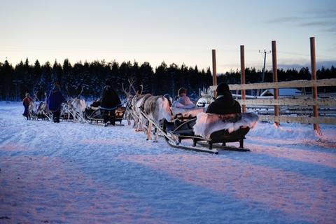 雪に覆われた風景を進みながら、オーロラの幻想的な光に包まれます。冒険のハイライトはトナカイに引かれる魅力的なそり乗りで、穏やかで堂々としたトナカイたちに導かれて真っ白な雪原を進みます。星空の下で静かに滑り、ラップランドの静かな美しさに囲まれた時間をお楽しみください。