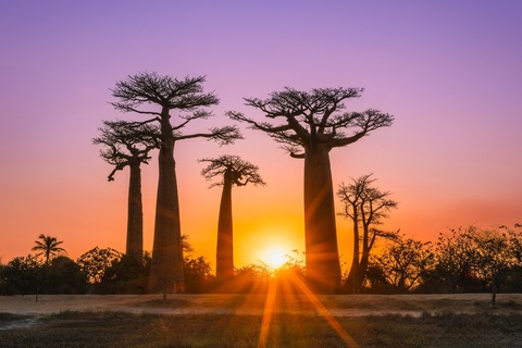 • バオバブ通りでのサンセット鑑賞 夕暮れ時のバオバブストリートでは、赤く染まる空と巨木のシルエットが幻想的な景色を描きます。