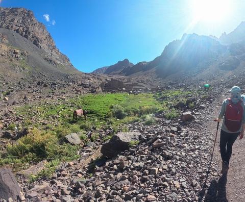 午前中にイムリルへ戻る下山行程です。ゆるやかなルートをゆっくり進みながら、アトラス山脈の景色と山麓の穏やかな雰囲気を楽しめます。