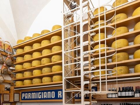 朝はコーヒーとペストリーの典型的なイタリア式朝食から始まり、その後パルミジャーノ・レッジャーノの乳製品工房へ向かい、チーズ製造の過程を見学して異なる熟成度の試食を楽しみます。