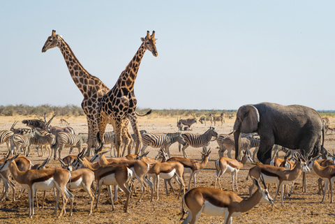 広大な塩湖と乾いたサバンナを有するエトーシャでは、水場を中心にゾウやライオンなど多種多様な動物が姿を見せます。