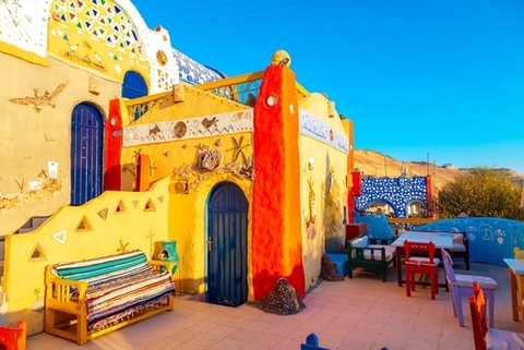 • ヌビアの村 アスワン近郊に点在するカラフルな村落で、古代から続くヌビア文化と人々の暮らしを今に伝えています。砂漠とナイルの間に広がる集落には、幾何学模様や鮮やかな色彩で彩られた家々が並び、訪れる人を温かく迎え入れます。伝統音楽や手工芸、スパイスの香りが漂う市場など、どこか懐かしく穏やかな時間が流れます。ナイルの恵みとともに生きるヌビアの人々の笑顔には、この土地の豊かな歴史と誇りが息づいています。 [English Guide]