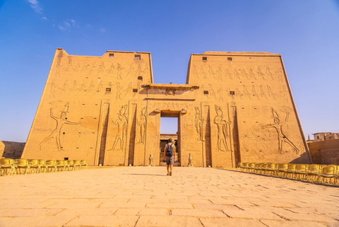 • エドフ神殿 ナイル川西岸の町エドフに建つ、ホルス神を祀る壮麗な神殿。プトレマイオス朝時代に建設され、現存するエジプト神殿の中でも保存状態が最も良いものの一つとされています。巨大な塔門と精緻なレリーフは圧巻で、神話に登場するホルスとセトの戦いが壁面いっぱいに刻まれています。神聖な儀式の行われた回廊に足を踏み入れると、古代の祈りと王権の威光が今も静かに息づいているのを感じます。 [English Guide]