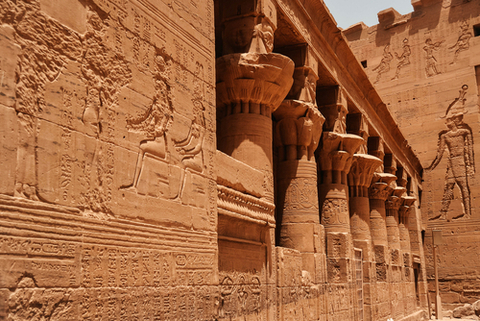 • フィラエ神殿 ナイル川の中州に浮かぶ美しい神殿で、イシス女神を祀る信仰の聖地として知られます。かつては水没の危機にさらされましたが、ユネスコの支援によって現在のアギルキア島へと移設され、往時の姿を見事に再現しています。優美な列柱と繊細なレリーフが並ぶ神殿は、夕暮れには黄金色に輝き、水面に映る光景は幻想的。古代信仰の終焉と再生を象徴するこの地は、静けさの中に永遠の祈りが宿る場所です。 [English Guide]